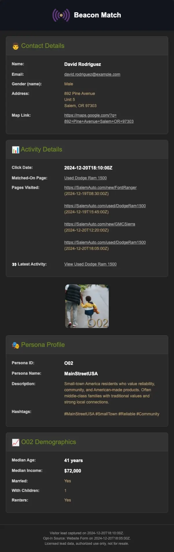 Their contact information, interests, and vehicle research flow instantly to your marketing platform —ready for immediate outreach.